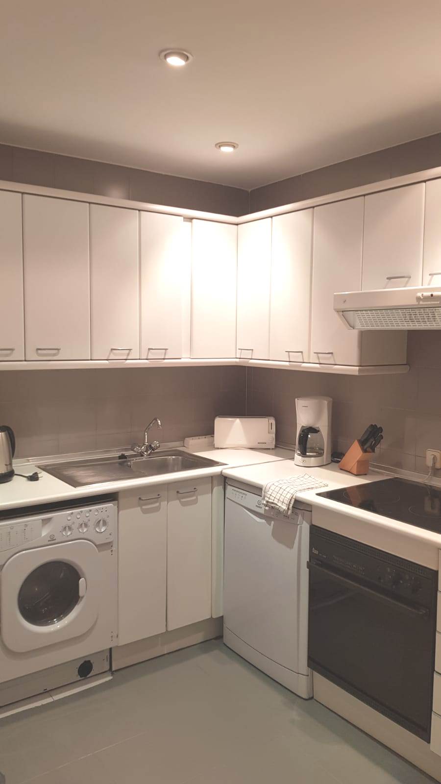 Kitchen fully equipped with fridge, freezer, kettle, toaster, frying pans, bowls, cutlery, etc . washing machine, microwave, oven, etc.