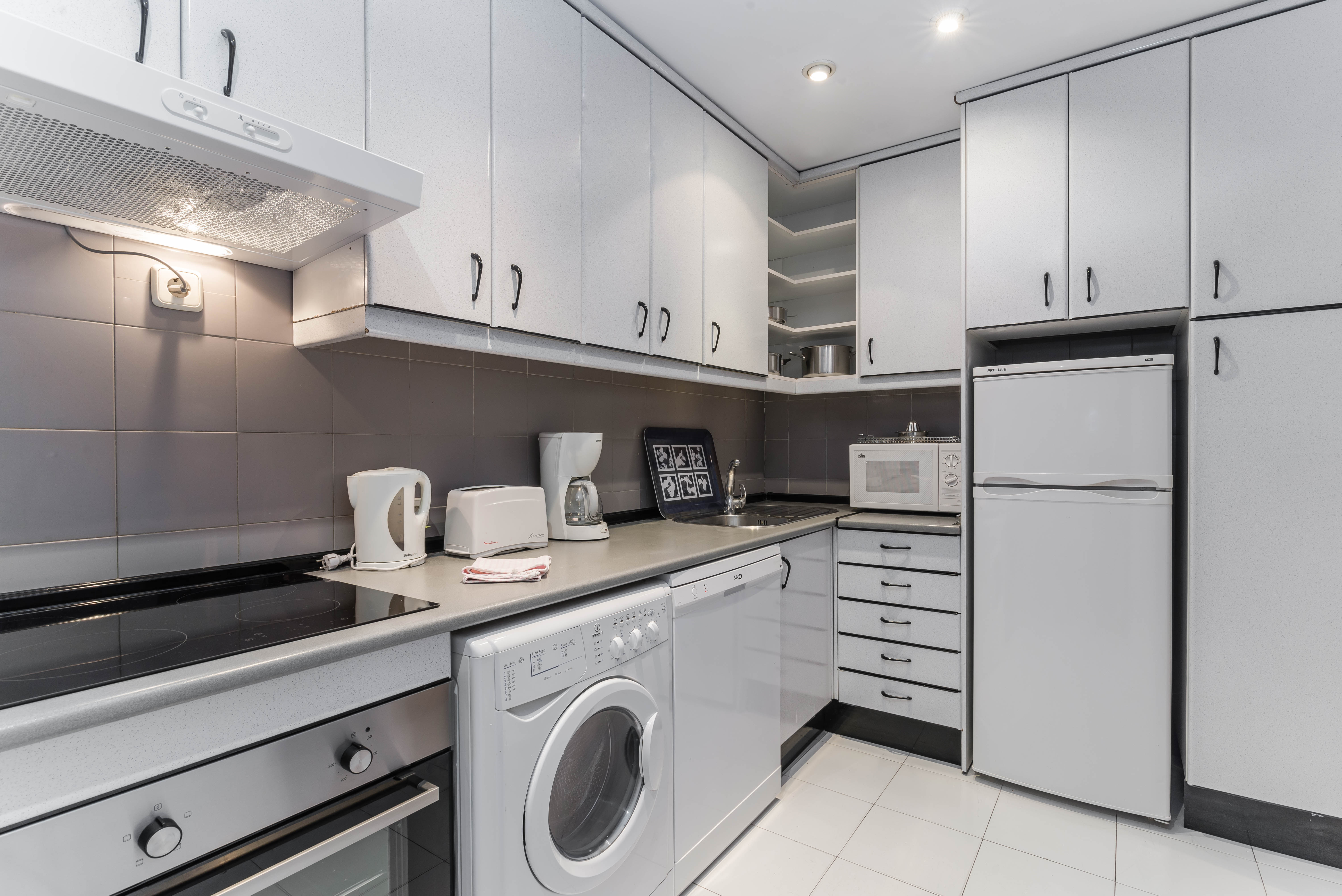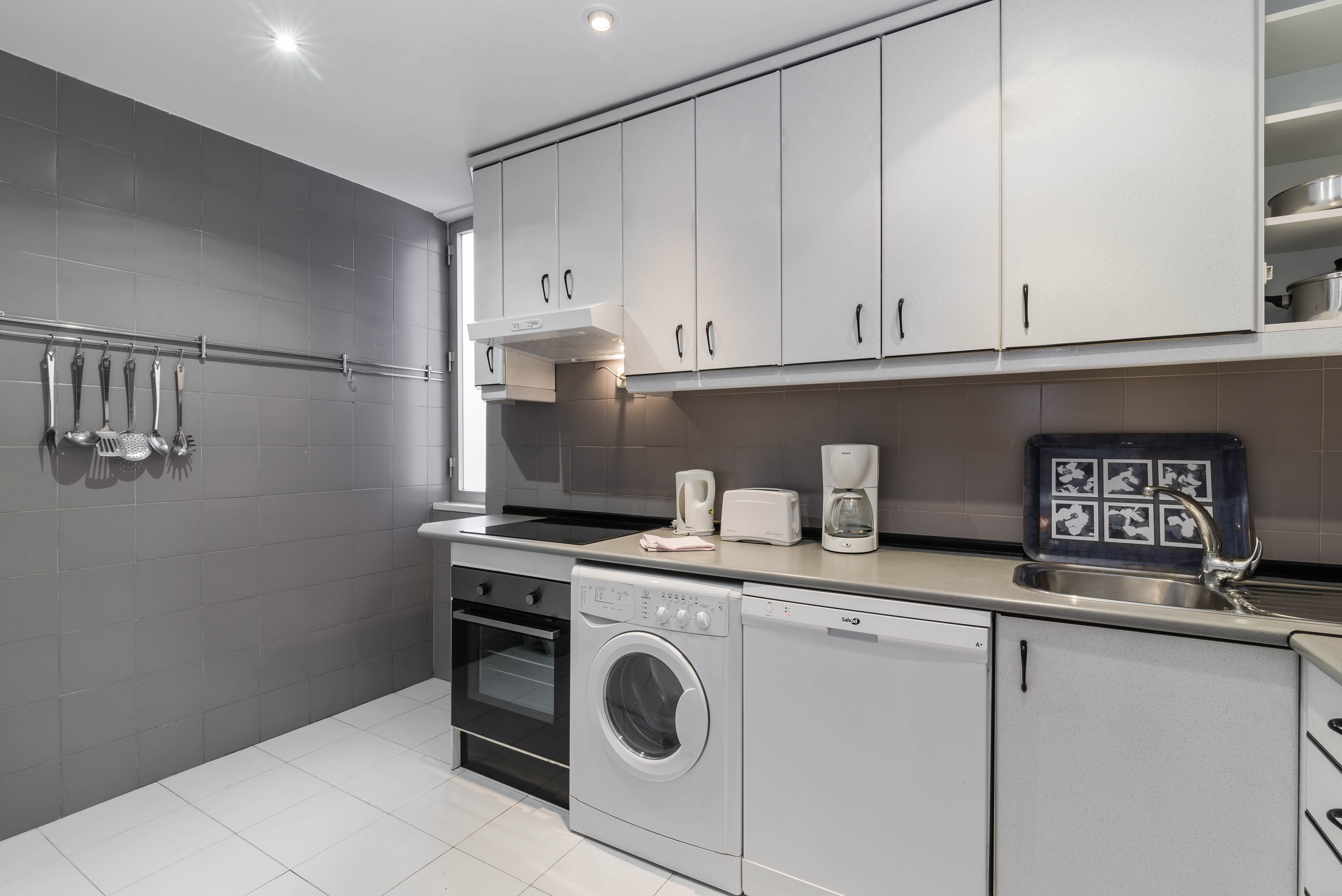 Kitchen fully equipped with fridge, freezer, kettle, toaster, frying pans, bowls, cutlery, etc . washing machine, microwave, oven, etc.
